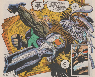 Much like Morrison’s New X-Men would later do, Lobdell and Nicieza cast Magneto as little more than a modern Nazi. Havok challenges the Acolytes killing humans in Magneto’s name, “Out to destroy the ‘inferior race’ — in Magneto’s name? Don’t you know what an insult that is to the memory of the very man you claim to worship?” The comparisons are made on more than methodology. During an interrogation, Toad wonders, “How did Hitler rally his country around him? Through the incredible allure of his confidence — Magneto was much the same way, in that regard.”