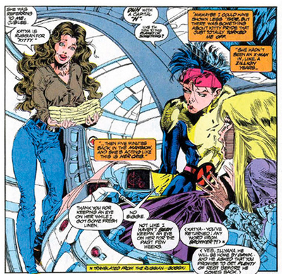 However, this attempt to radically strike away from Claremont is somewhat undermined by the fact that Scott Lobdell seems to be consciously emulating the writer’s famous quirks. There’s a lot of antagonism on the team, a lot of mysterious subplots ticking away, with both Gambit and Bishop presented as mysterious outsides. Lobdell’s writing apes the more awkward stylistic quirks that one associates with Claremont.