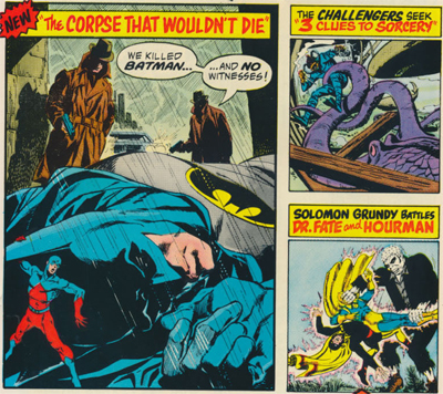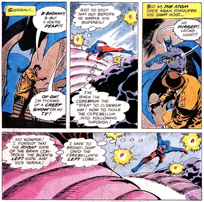 Even a “clinically dead” Batman is still a force to be reckoned with during a later story. Piloting the hero from inside his brain, the Atom encounter resistance when he tries to redirect zombie!Batman away from the front door of an enemy’s hideout. “He’s going right up to the front door –! No! Got to race back to the cerebrum… give him another idea! Yeeow! Hot electric current hitting my feet! It’s like he’s fighting my idea… sticking to his own! I’d better cooperate!” Brain-dead or not, there’s no way anyone is going to stop Bob Haney’s Batman from beating up some bad guys.