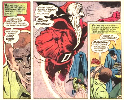 Indeed, all of Haney’s characters seem remarkably kill-happy. At one point, Batman doesn’t bat at an eye at Deadman’s calculated murder of a woman he fell in love with. “If Lilly kills Batman, she’ll rot in prison!” Deadman rationalises. “She may as well be dead! But if I kill her, she’ll be free of this crummy life…” Yes, he sounds just a little like a serial killer. Rumour has it (although O’Neil denies it) that Denny O’Neil and/or Neal Adams were unhappy with Haney’s kill-happy Green Arrow and even wrote a subsequent story as a response. When Man-Bat’s half-thought-out scheme kills two CIA Agents, Batman seems fairly blasé about it. “That’s a big chunk of guilt you can lug around! Now let’s move on… before we meet the same end!” (I am not paraphrasing, that’s the quote.)