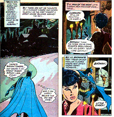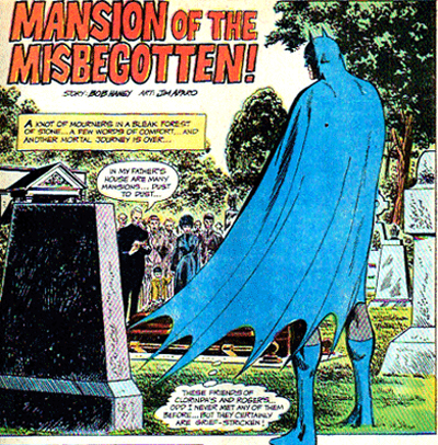 Batman even seems to maintain a pretty active social life. Not Bruce Wayne, but Batman. The guy in the cowl. The first story, Mansion of the Misbegotten, introduces us to a character on his death bed. We’re told that he and Batman are “oldest and best of friends.” Asked to take care of the man’s child, Batman responds, “I’m Enoch’s godfather.” I imagine that was the best Baptism ever. It doesn’t even seem like Batman just popped in every once in a while either, he seems put out that he doesn’t recognise anybody at the funeral. “These are friends of Clorina’s and Roger’s… Odd I never met any them before…”