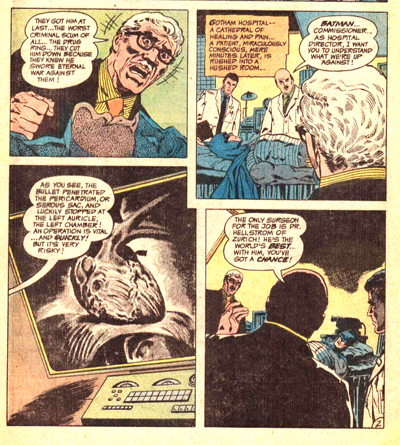 Almost foreshadowing the contempt Frank Miller’s Batman would show for his fellow costumed heroes, Batman proceeds to play the team like a drum as “Mr. Arachnid.” And, even facing life-threatening surgery, Batman remains completely in control of everything. The other heroes are completely dependent on him, so much so that they can’t function without him during his operation. Green Lantern declares, “Batman was our brains… our nerve centre! Let’s get to the hospital!” Not to wish a friend well, but because the three can’t foil a simple drug ring without him.