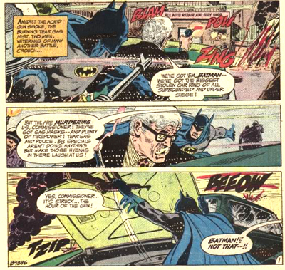 Haney’s Batman even seems like a bit of ladies’ man, remarking on a dead friend’s widow at one point, and eager to get back to a pretty lady he saved from an attack. “Now I’ve got an unfinished date, Commish — with a beautiful senorita!” It seems a little cold, given that the woman’s mother is in hospital, but that’s how he rolls. This version of the character isn’t a creature of the night, but even takes the opportunity to sign autographs.