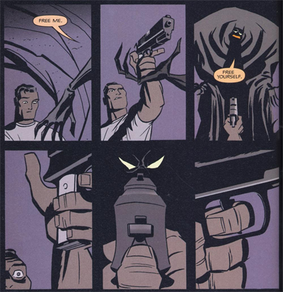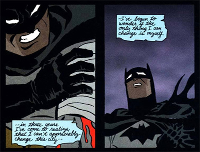 Cooke’s Ego seems to explore that post-Miller portrayal, in the same way that Grant Morrison’s Batman & Robin or Doug Moench’s Prey might attempt to. When Cooke separates the Batman from Bruce and gives it a pure form, it sounds a lot like Frank Miller’s grizzled old Batman. “You think you know pain, you coward?” it goads Bruce by way of introduction. “I will show you pain.” Even from the introductory monologue, Bruce speaks in a voice quite similar to the one that Frank Miller gave him, speaking of his “mission” in the almost religious tones that Miller’s Bruce used. (Indeed, the demonic personification of Batman muses, “But lately you’ve been lacking faith.”) Cooke’s Bruce worries. “That the city I’ve given myself to — threatens to crush me — with the weight of my commitment to her.”