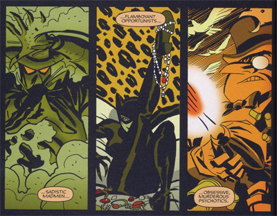 Cooke clearly sets his story in the era after Year One. That is the case literally (Bruce identifies it as the third year of his mission), but also metaphorically. The story is set in an especially dark and violent Gotham, albeit one populated with Batman’s colourful freaks. It opens with the Joker’s henchman killing his family and committing suicide, afraid of what his boss will do to them. This isn’t a fun adventure. This isn’t kooky comic book shenanigans. Batman himself lays out the scene, “The Joker. A looting and killing spree at a charity ball. 27 dead. What horrifies me most — is I seem to be getting used to it. The pain. The death. Not numb, but used to it.”