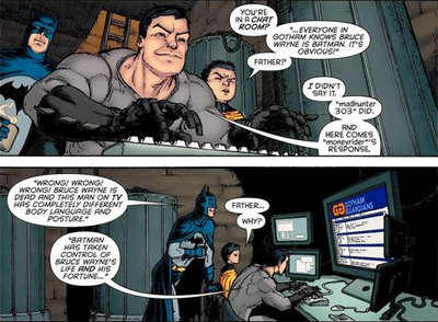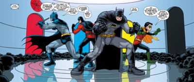 Even the bad guys get in on it. Tim Drake remarks on the labyrinth of Doctor Dedalus, “Check this out — the lights and colours and noises are a distraction — the whole thing.” As they escape, Batman explains, “Netz was misdirection, to waste our resources on the eve of war.” Morrison even uses this logic to rationalise why nobody simply killed Bruce Wayne after he announced he funded Batman. Nobody knows for certain, as Bruce is so brilliantly muddying the issue. As the briefing states to the Average Joes, “Wayne’s in Kuala Lumpur, Batman’s in Hong Kong. Batman’s a girl. Then Batman’s in Melbourne, Australia.” Misdirection seems to be an essential part of Morrison’s Batman. We saw it earlier with the identity of Doctor Hurt, and it comes into play here as well. Morrison cleverly keeps his audiences guessing about the big picture. As a side note, my pet theory is that the new Wingman is Jason Todd, if only because Morrison’s kinder and gentler Bruce would probably do well to redeem his former ward, while Todd has been left out of the extended celebration of the Batman legacy.