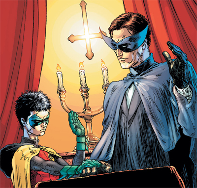 It’s hard not to hear lines from Nolan’s saga as Morrison muses about the importance of misdirection to Batman. “Conjurers and con men call it misdirection,” the Hood muses as he kicks his plan into action, and it seems like everybody uses it. Offering strategic advice to Bruce, Alfred suggests, “Think ahead, deploy your forces for maximum impact and strike hard while the other chap’s got his eye on the wrong square.” As a wise man once told Nolan’s Bruce Wayne, “Theatricality and deception are powerful agents.”