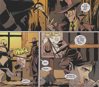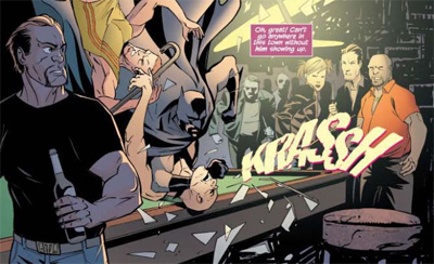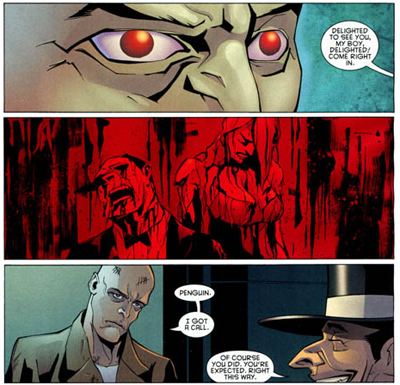 In what little we see of him, the Joker seems more like Mark Hamill’s crazy mobster than Grant Morrison’s fourth-wall-breaking monster clown. There are several moments where you can almost hear Hamill’s voice. “But you know what they say, ‘Dead men tell no tales,'” he warns one captive, only to reconsider, rationally. “Hm. Which doesn’t help a man trying to build a reputation in this town.”We even catch glimpses of an origin for the character, as a sexually abused orphan – one which set shim up as a fitting counterpoint to Bruce. Truth be told, I’m not mad about the idea of an origin for the character, especially not one that provides a motivation for anything he does after the transformation, but it’s ambiguous enough that it doesn’t intrude too much – it just feels like a strange plot element to include.