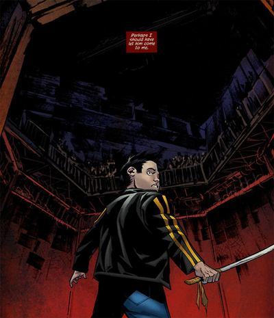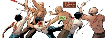 However, Dini seems to have difficulty writing Damian interacting with his own creation, the new hero “Abuse.”The character of Damian doesn’t lend himself to public displays of affection, and certainly not respect. Dini attempts to rationalise this (at least internally) as an attempt to win a new ally, but it doesn’t wring true. After all, Abuse is arguably just another rival for his father’s affection, like any costumed hero in Gotham – especially a younger one. While he’s not an adopted son like Tim Drake, Damian has to know that the kid harbours fantasies of working with Batman, and it seems out of character for Damian to support and embrace him like that.