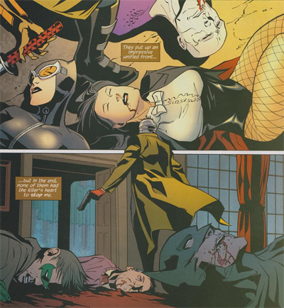 It goes without saying that Dini writes a very good Thomas Elliot. While Jeph Loeb’s Hush was big on spectacle, it hardly granted Batman’s newest foe a lot of personality, and I think Dini deserves a lot of credit for rehabilitating the character and turning him from a one-note gimmick character established as an excuse to bring Batman’s foes together so Jim Lee could draw them into a credible threat with his own pathology and methodology. Dini writes a wonderfully dark and cynical inner monologue for Hush, and I wouldn’t mind if Elliot served as the series’ focal point – but instead he’s absent for most of the middle of the run, despite playing a large part at the beginning and the end.