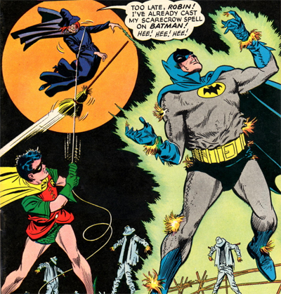 It really doesn’t matter that the writers try to explain these things away as “SCIENCE!”, as was the style in the Silver Age. A witch on a broomstick turning Batman into a scarecrow is still a pretty fantastic and ridiculous villain, regardless of how the story might try to rationalise it. The Outsider boasts, “Actually, of course, there are no ‘witches’ and no ‘magic! But some people — like the woman I singled out to be my agent — possess extra-sensory powers which the broomstick — being of a rare wood found only in a certain place on Earth — can release like a catalyst in a chemical reaction!”That doesn’t really make a difference, it’s still the silly gimmickry that supposedly got the title in trouble in the first place.