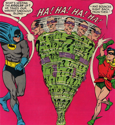 He seems to have to rationalise “cheating” with his riddles when he needs to throw Batman off the cent – even though he isn’t playing by a set of external rules. The Riddler isn’t obliged by any external force to leave clues, so why does he feel the need to justify being a little underhanded? “But I played fair!” he insists to himself, when it looks like he might actually get away. “I gave Batman the necessary clues! If he misinterpreted them — that’s his tough luck!”There are already hints that the Riddler is the ultimate self-defeating bad guy, the character who would probably get away with his crimes if not for his pathological need to prove himself smarter than Batman.