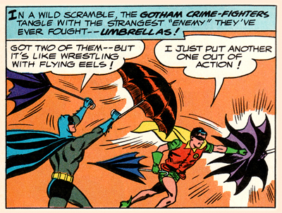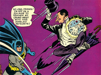 “Tell me boss,” a goon asks as the Penguin engages his plan, “why did you move your monocle to the other eye?” The Penguin responds, “Just strategy, Herbie! It’s a little something else that’ll keep Batman guessing — keep him worried! That’s the only reason I did it!” I love that the Penguin knows how completely OCD Batman is, and just how to screw with him – and how to really get at Batman in a way that will frustrate the Caped Crusader more than any attempt to kill him with a trick umbrella. The best part, however, is that it works. At the end, Batman boasts, “The case is beaten, Penguin– except for the mystery of why you pulled the monocle switch! We’re taking it along for further study!”The Penguin, quite rightly, counts it as a victory.