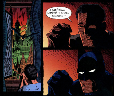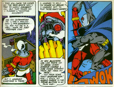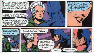 The writing is just a tad melodramatic, but the idea is clever. Afflicted by Scarecrow’s Fear Toxin, Bruce’s world literally collapses around him. “Silver caused it!” he laments as he regresses to the form of a young boy. “Can’t keep my vow! Made… when I was… a boy…! And what does a boy know of women–? What does he know of love?” Bruce’s love of Silver is finally something that Bruce could embrace as an adult, instead of indulging his own dark childish fantasies, with his little trophy room, gimmicks and outfits.