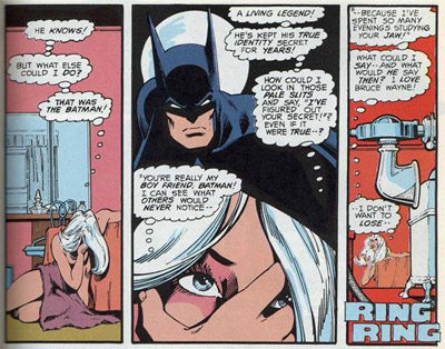 Englehart is the first writer to really identify Batman as a childish fantasy that stuck with Bruce into adulthood, as a means of coping with his traumatic loss. The implication is that Bruce simply never grew up, because he never wanted to. And so, as a clever way of generating internal conflict, Englehart introduces a genuine romance, one that Bruce is actually engaged in. Silver St. Cloud exists as more than an editorially-mandated “beard”, a female character introduces to assure the audience that Bruce was straight. Instead, Englehart dares to ask what happens when Bruce finally has a reason to want to grow up?