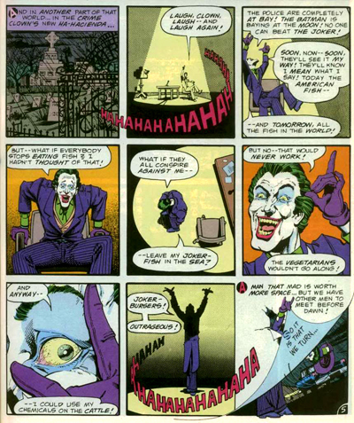 Pondering what to do with Silver St. Cloud, he suggests, in a sinister fashion, “I’ll lock you away in a tower of this house and watch as your pale skin shrinks tight across your paler bones till you become my bride of death…” Then he pauses, and waves the idea off. “Nah–! It was just a synapse firing.”It creates the impression that the Joker has his head flooded with these sorts of grotesque and insanely random ideas all the time, and that’s what makes him so difficult to predict, and so interesting as a foe for the stoic Batman.
