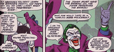 In fact, his fascination with Batman seems to suggest he’s aware of the laws of narrative. When Silver points out that he tries to kill Batman, despite being co-dependent with the Caped Crusader, the Joker insists that he knows he cannot kill Batman. “Of couse I try to kill him! Because he’s my perfect foe! If I ever killed him, he’d be my im-perfect foe!” Englehart’s Joker is the first version of the character who actually has no interest in Bruce Wayne, or even in discovering how Batman actually is.