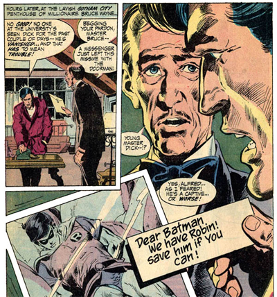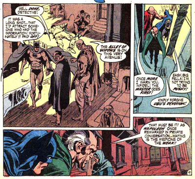 There’s an emphasis here on Batman as a detective, another aspect that O’Neil and Adams brought back to the fore. I know that Schwartz’s “new look”had made a conscious attempt to integrate that part of the character, but those mysteries often relied on some handy bit of pseudo-science to tidy everything up, like an after-school special. Here, O’Neil and Adams are continually and consciously goading the reader to figure out the mystery before Batman does, with captions occasionally hinting that the vital clue was masked within the last few pages.