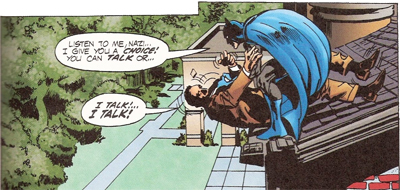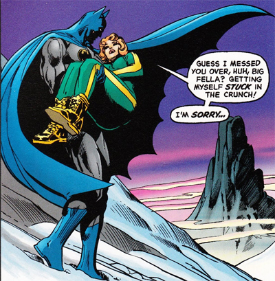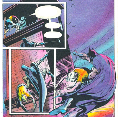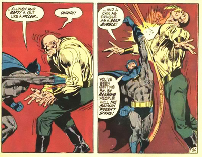 O’Neil and Adams point to children as something of a sore spot for Bruce. At any point during the run, threatening a child is liable to provoke a brutal beatdown from the Bat, with a stern tone and the threat of even more violence. “Where’s the youngster…?” he demands while trying to find a missing kid. “Answer… or you’ll regret the day you were born!” According to Bruce, “Anyone who would victimise a kid… is worse than contemptible!”It’s a natural and logical character beat, and one that makes a lot of sense given the character’s origin.