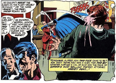 Suddenly the gimmick becomes a compulsion, and the character gains a whole new dimension, as he becomes a character with no real control over his own life. It isn’t that he abdicates responsibility for his actions, something that would make him a villain. It’s that he can’t make decisions without it, which makes him a lot more tragic. Batman smartly plays this against him at the climax of the story, as Two-Face attempts to contol his need to flip the coin. “Two-Face tries to ignore it…. but can’t!” It’s a fairly logical way of looking at the character, but O’Neil does that wonderful thing where he finds something that in hindsight really should be obvious and blends it seamlessly to the character.