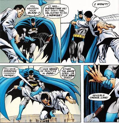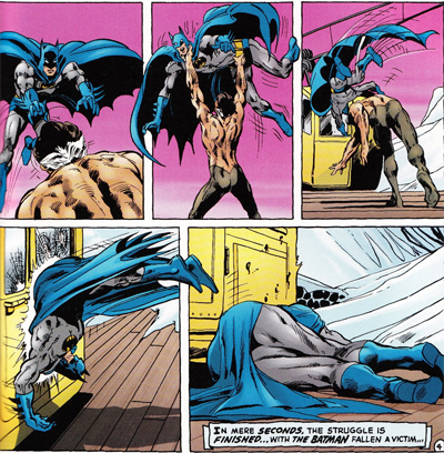 This tradition stems back to O’Neil himself, who repeatedly implies – even if he never explicitly states – that Batman is willing to put Ra’s down in order to stop him. “Though I’ve never intentionally killed,” Bruce declares, issuing a challenge, “I swear you will not leave here alive unless you surrender!” Given Ra’s is unlikely to surrender, it’s a pretty bold statement. (Similarly, Bruce thinks something quite similar during the climactic battle in O’Neil’s Birth of the Demon, his Ra’s Al Ghul origin story.)