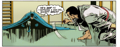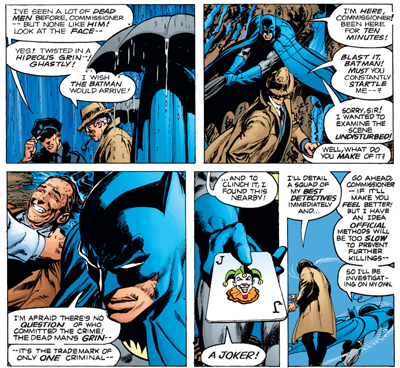 “Come on, Batman!” Gordon offers at one point, “I’ll drive you…” An earlier version would have accepted the invitation so they might talk, or used it as an opportunity to show off some fancy Bat-gadget. While Batman’s response isn’t rude by any stretch, it does confirm that he operates outside the system. “You have your transportation… and I have mine!” Rather than announcing his present and acting almost like a deputised law man, O’Neil and Adams have their Batman skulking silently around the crime scene, with even Gordon unaware. At the start of The Joker’s Five-Way Revenge, Gordon wonders why Batman hasn’t arrived yet. The response is swift. “I’m here, Commissioner! Been here for ten minutes!”