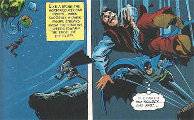 In Paint a Picture of Peril, we’re told that the subject of Batman’s investigation lives in a castle “removed from Spain.” In Ghost of the Killer Skies, Bruce is hanging around on the set of a movie filming in Spain. I just find it interesting that Bob Haney had a similar fixation on Hispanic culture during his own The Brave and the Bold run. Although O’Neil’s “el Hombre Murcielago!” does sound slightly more convincing than Haney’s “Bat-hombre!” Sorry, that was a strange tangent, even by my standards.)