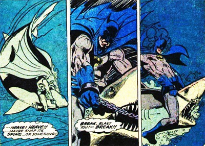 It’s interesting how O’Neil and Adams combine the Golden Age and the Silver Age approaches to the character. The appearance owes quite a bit to Batman #1, the Joker’s first appearance. The Joker is killing people, leaving them disfigured. Batman knows in advance who the Joker is going to kill, but proves fairly ineffective at stopping the prankster. However, the issue also features one of the all-time great Batman moments, as the Joker inevitably puts Batman in an elaborate deathtrap. It might be a bit more practical than the Joker’s Silver Age madness, but it’s still a deathtrap. Of course, this one features Batman wrestling and defeating a shark. And, with Neal Adams drawing, it is awesome.
