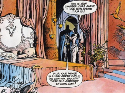 Barr knows that Batman’s can’t have a “normal” life involving settling down and raising a family, because Bruce is inherently dysfunctional. The best he can do is to find somebody who is as deeply screwed up as he is and who can accept him for who and what he is. In that respect, Talia is the perfect match for Bruce, if only because the presence or absence of the mask doesn’t affect her attraction to him. Selina Kyle is attracted to Batman moreso than Bruce Wayne, and the “Wayne girls” Bruce has on his arm date Bruce rather than Batman, while Talia seems just dysfunctional enough to accept both facets.