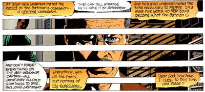 None of Strange’s insights are especially deep and profound – dismissed by other characters as “useless and irrelevent psycho-babble.” Even the normally level-headed Gordon has no time for Strange’s attempts to make himself seem important by over-analysing the Caped Crusader. “Oh, for pity’s sake!” Gordon yells. “He just wants to scare the pants off criminals!”Despite his fancy degrees and qualifications, Strange doesn’t understand Batman nearly as well as Gordon. Deduces that he was the victim of a trauma, but gets the time wrong. He doesn’t realise Bruce must have been a child, or how he must have prepared to be Batman.