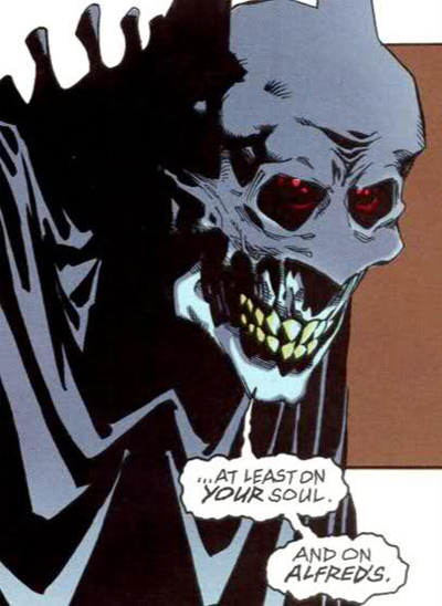 Indeed, Batman: Vampire paints a pretty unflattering portrait of Alfred, but not necessarily an unfair one. Alfred is an enabler, a man devoted to his master and in allowing his master to accomplish what he set out to do. He’s loyal and unquestioning. These might seem like virtues, but only if Batman’s moral righteousness can be assured. It is Alfred, after all, who resurrects the vampire Batman to prey on the criminals in Gotham, with little thought beyond loyalty to his master. “You f-fool,” the skeletal Batman mocks the faithful butler. “What will it take… for you to abandon me?”