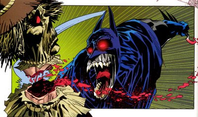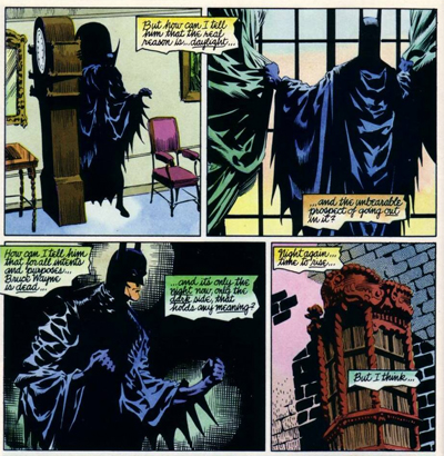 Indeed, the last page of Red Rain presents a grotesques Batman reaching out toward Alfred. “Bruce Wayne may be gone… but the Batman will go on…” Batman seems content with this status quo, but both the reader and Alfred are invited to see it as grotesque. Towards the end of the third book, Crimson Mist, Batman has become nothing but a frail skeleton inside the familiar cape and cowl – the Batman iconography remains, but the work is withered and weakened. Being a vampire, it’s because of lack of blood – but Moench and Jones seem to be portraying a Batman who has sacrificed Bruce Wayne in order to further his own grim quest.