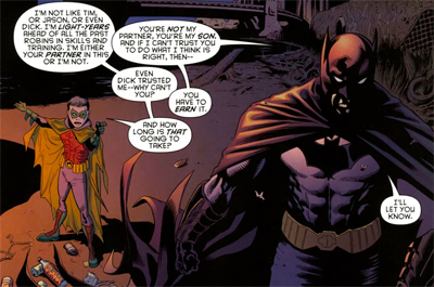 The moment Batman sends a kid into the line of fire is the night he doesn’t believe there’s a chance that things could go badly. It’s either that, or Batman simply doesn’t care – which is a character I would have difficulty caring about. Let’s assume that Batman does care about Robin. He’d never send a kid out into that situation if there were a serious chance of death or something like it. And if Batman doesn’t believe that there are any stakes in this narrative, why should I?