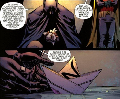One gets the sense that Bruce would have enough trouble with a normal child, but is ill-equipped to deal with a kid who harbours as many problems as Damian. He makes the mistake of confusing attention for affection, at one point even buying Damian a dog, and somehow hoping that the dog by itself will be enough to help set Damian straight. “I got him for you, Damian,” Bruce tells his son. “You bought him to be a distraction,” Damian responds. Damian doesn’t want gifts or anything material – he wants his father to be affectionate, to be proud, to trust him. Unfortunately, Damian is too closed off to tell Bruce this, and Bruce is too closed off to realise it.