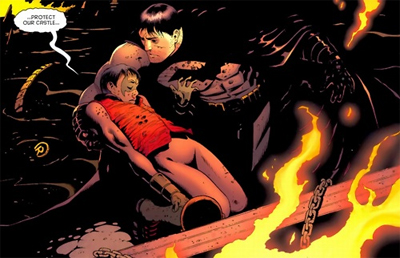 The character of Damian doesn’t pretend that the concept is absurd. Instead it grabs that absurdness and runs with it. After all, being used by your mentor as a child soldier in his one-man war on crime is highly unlikely to produce a rounded and functioning individual like Tim Drake or Dick Grayson. Damian is already messed up, through some thoroughly insane ninja training from his mother. Somehow, this makes Bruce’s decision to let him do all this incredibly risky stuff seem less irresponsible that drafting in his young wards. Damian is so ridiculously messed up that this is probably the closest thing to a healthy childhood for the kid.