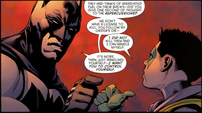 This does provide an interesting framework to explore Damian’s conflict – torn between his training as an assassin and his father’s vow not to kill – there’s a sense that we’ve been here before, and recently too.It is nice to hear Bruce articulate his reason and logic in such a way that doesn’t rely on an easy “slippery slope”argument, instead suggesting that this simply isn’t the way that he does things. I think that’s really all the justification you need.