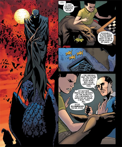 That said, Tomasi does broach some interesting ideas, particularly when the villain decides to mercy-kill some foes that Damian had crippled. “That’s cold-blooded murder!” Damian insists. Nobody responds, “It’s semantics.” Batman can be incredibly indifferent to the consequences of his actions – after all, is the distinction that great between killing and maiming? It seems statistically unlikely that Batman has been able to doll out so much punishment without causing any permanent injuries, including possibly brain damage.