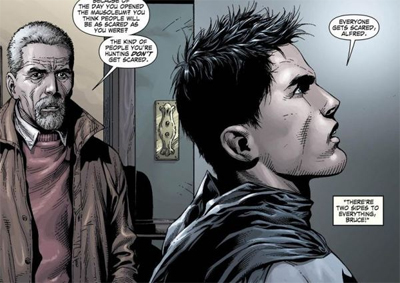 Appropriately enough, given that Nolan’s films employed what might be described as a “Johnsian literalism” towards the use of fear by Batman, Johns himself leans rather heavily on the idea of Batman employed fear as an agent in his war on crime, explaining the otherwise ridiculous costume. “The kind of people you’re hunting don’t get scared,” Alfred warns him. “Everyone gets scared, Alfred,”Bruce replies.