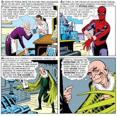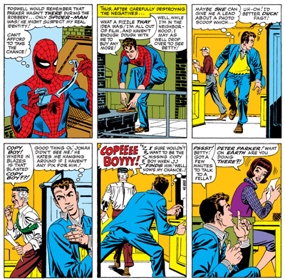 Ditko and Lee even explain why Peter is stuck selling photos of Spider-Man to J. Jonah Jameson, the media mogul who is intent on smearing Spider-Man’s name. One would imagine that Peter would get sick of selling the photos to a guy waging a one-man-war on the webslinger, but it seems like Peter literally has no other choice. Peter obviously doesn’t want his name on the pictures, and doesn’t want to answer questions about how he takes them. So Jameson’s lack of journalistic ethics make him the perfect patsy to buy the photos. Any credible news company would ask all manner of awkward questions.
