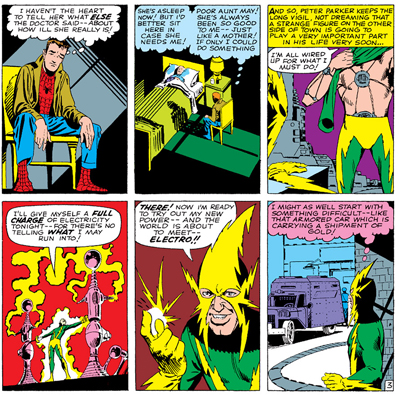 Even the villain Electro comes across as vaguely sympathetic – in that he doesn’t seem like a completely insane psychopath. He doesn’t wish harm on Peter Parker or anyone else, he just wants money. After knocking Spider-Man out, he thinks, “I didn’t mean to do that — but it was his own fault! He didn’t give me a chance to explain the danger of touching me!” Like a lot of Spider-Man’s foes, Electro is motivated primarily by greed. His origin story features the character refusing to help a trapped co-worker unless he gets a bonus. It provides an interesting contrast with Spider-Man’s altruism. Rather than using his formidable power in order to profit, Spider-Man selflessly uses it for good.