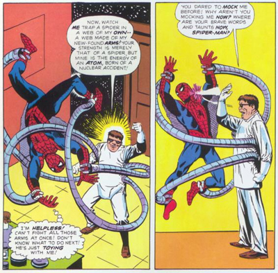 Much like a lot of the villains, Doctor Octopus serves as a reflection of Peter. Beyond the whole eight-legged-animal-motif, Octavius is a brilliant individual convinced that the world looks down on him. “They’re jealous of me!” he insists. “They want to keep me from my work!” We are, of course, talking about sixties comic books, so his motivations aren’t always the most consistent. He is already focused on Peter by his third appearance, vowing, “I’ll never rest till I’ve smashed him!” In fact, he even organised the Sinister Six just to get back at Spider-Man.