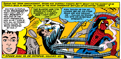 Interestingly enough, at one point early in the book, Spider-Man seems pretty indifferent to the potential death of Doctor Octopus. During a fire, he reflects, “What’s the matter with me! I’ve been so worried about Doc Ock, I forgot about myself!!” It feels particularly strange for Parker to be so casual about the potential death, even of an adversary. After all, Peter is a character who is normally so preoccupied with responsibility. That said, perhaps it’s an intentional attempt to show growth. Later on, he is faced with two goons trapped under water (while Octavius is masquerading as “the Master Planner”). Feeling more in character, Peter thinks, “I can’t just let them drown — even though they probably deserve to!”