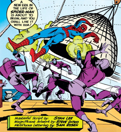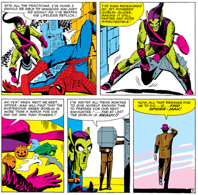 It’s also interesting to note how expressive Ditko’s characters are. Although Ditko was careful to give Peter Parker at least as much page-space as his alter-ego (compensating by frequently using the iconic “Ditko Spider-Man half-face”), it’s worth reflecting on how expressive Spider-Man can be even when we can’t see his facial features. Similarly, I adore the Green Goblin’s expressive hand gestures, as he seems to be constantly adjusting his mask. In case you don’t quite get it from all I’ve written, I adore Ditko’s artwork here. That said, as important and influential as Ditko’s artwork here may have been, I think it was just one part of a larger puzzle.
