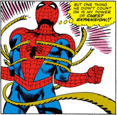 The villains aren’t necessarily the most rational bunch either. At one point, Doctor Octopus frees a zoo for some reason. The Green Goblin’s first plan to get at Spider-Man involves casting him in a movie. Osborn pays half of a payment-on-delivery deal with money he has cut in half. “You know I’ll pay off, since my half is worthless to me now, anyway!” His logic is… flawless. Spider-Man has all manner of weird powers early on, including the Pamela-Anderson-esque “power of chest expansion.” Lee and Ditko even rope in the Ringmaster as a villain, not once but twice. His gimmick is that he runs a circus… of evil!