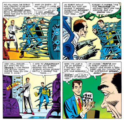 No matter. Peter fights Flash Thompson and the Living Brain goes on a rampage. “Anyway,” Peter notes, “everyone forgot about the paper with Spider-Man’s identity on it!” That’s a bit convenient, ain’t it? On the way home, Peter Parker thinks, “Tomorrow, I’ll say I lost the paper with Spider-Man’s identity on it during all the excitement, so that’s that!” Naturally, it never occurs to anybody to ask the machine again at some point in the future. Which makes the whole plot line a little bit pointless.