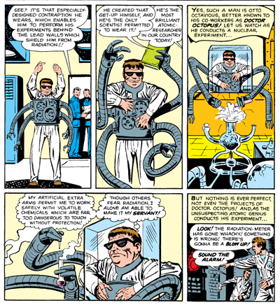 Even when he assumes the alias of the Master Planner, Doctor Octopus is fixated on nuclear power. “If my ray continues to function well and I can unlock the hidden secrets of atomic radiation, I shall be able to rule the world in time!” Sandman got his powers at “an atomic devices testing centre!”Ned Leeds attends a disarmament summit in Europe. Then again, such plot points were hardly uncommon in other Marvel comics of the time.