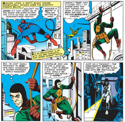Anyway, one can clearly see that the Ditko and Lee did believe that it was credible to wrap up a mystery without pinning it on any of the regular suspects. The reveal of the Crime Master’s secret identity is an anti-climax, as it was no doubt intended to be. After all, in a city with millions of people, what at the odds that the hero will know the person under the mask? “It’s kinda funny,” Peter thinks, “in real life, when a villain is unmasked, he isn’t always the butler, or the one you suspected! Sometimes he’s a man you didn’t even know!”