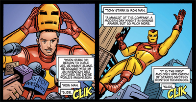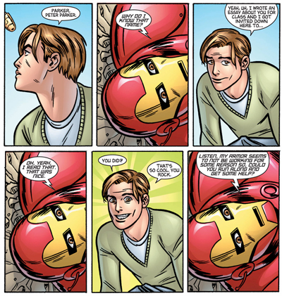 Bendis actually makes a point to firmly set Tony’s origin in the eighties – even including a cameo from Ronald Reagan. It’s interesting, if only because regular continuity has been reluctant to date the origin of late in stories like Extremis. That would suggest that Bendis’ Ultimate books might eschew the “sliding time scale.” For the less nerdy out there, the “sliding time scale” suggests that all comic book heroes debuted within the last five years, and that all their adventures fell within that timeframe, even those published forty-odd years ago. That explains why Spider-Man isn’t collecting his social security.
