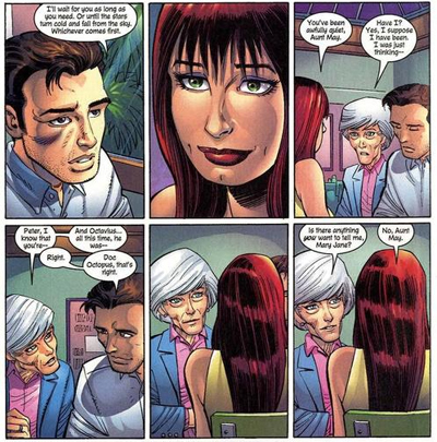 The irony, of course, is that it’s not really as big a deal as Peter may have thought. “All my life, I’ve dreaded having that conservation. I’ve lived in fear of it for years. Years. For a conversation that took a little under three hours.”May accepts him for who he is. Straczynski doesn’t afford Peter a cop-out by having his loving aunt endorse the idea, but he does suggest that May loves Peter enough to support him whatever her personal view.