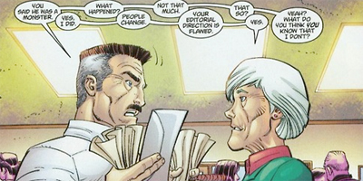 Straczynski, who worked on other cult projects, knows that he’s being provocative here. He’s effectively challenging the fundamental basis of The Amazing Spider-Man. “I am about to yank your chain like nobody else has before and nobody ever will again,” Ezekiel boasts, and it’s hard not to imagine Straczynski grinning from ear to ear as he wrote it. He even offers a good-natured self-parody later on with the movie hero Lobster-Man. The writer of the film protests that the classic origin has been thrown out. He complains, “They want something bigger, like he was summoned to the job by… get this… some kind of Giant Lobster God!” Such a suggestion is, of course, sacrilege. “Everyone on the internet who heard the rumour about this thinks it’s stupid.”
